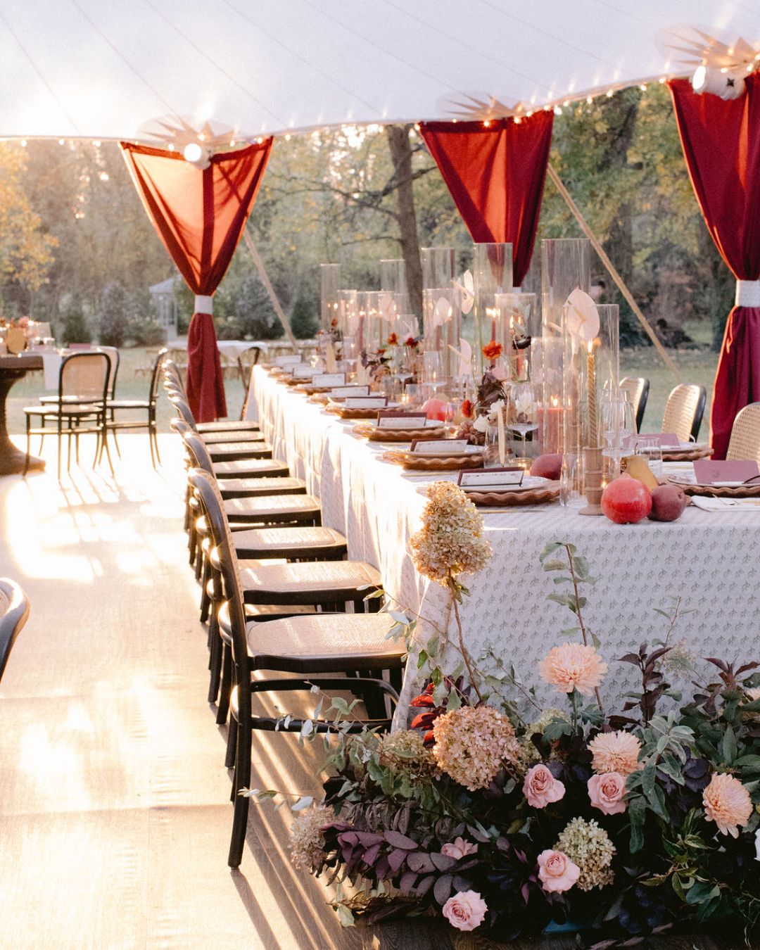 The reception unfolded beneath a tent, where warm lighting and rich textures created an inviting,